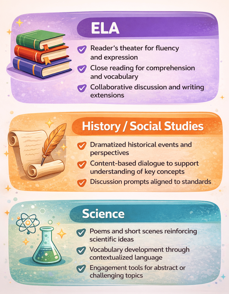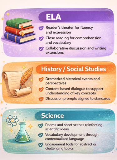 Drama Queen Collective’s works are designed to fit seamlessly into existing instructional time. Each play or poem integrates academic content with core literacy skills, allowing students to build comprehension, vocabulary, fluency, and critical thinking while engaging with required subject matter.